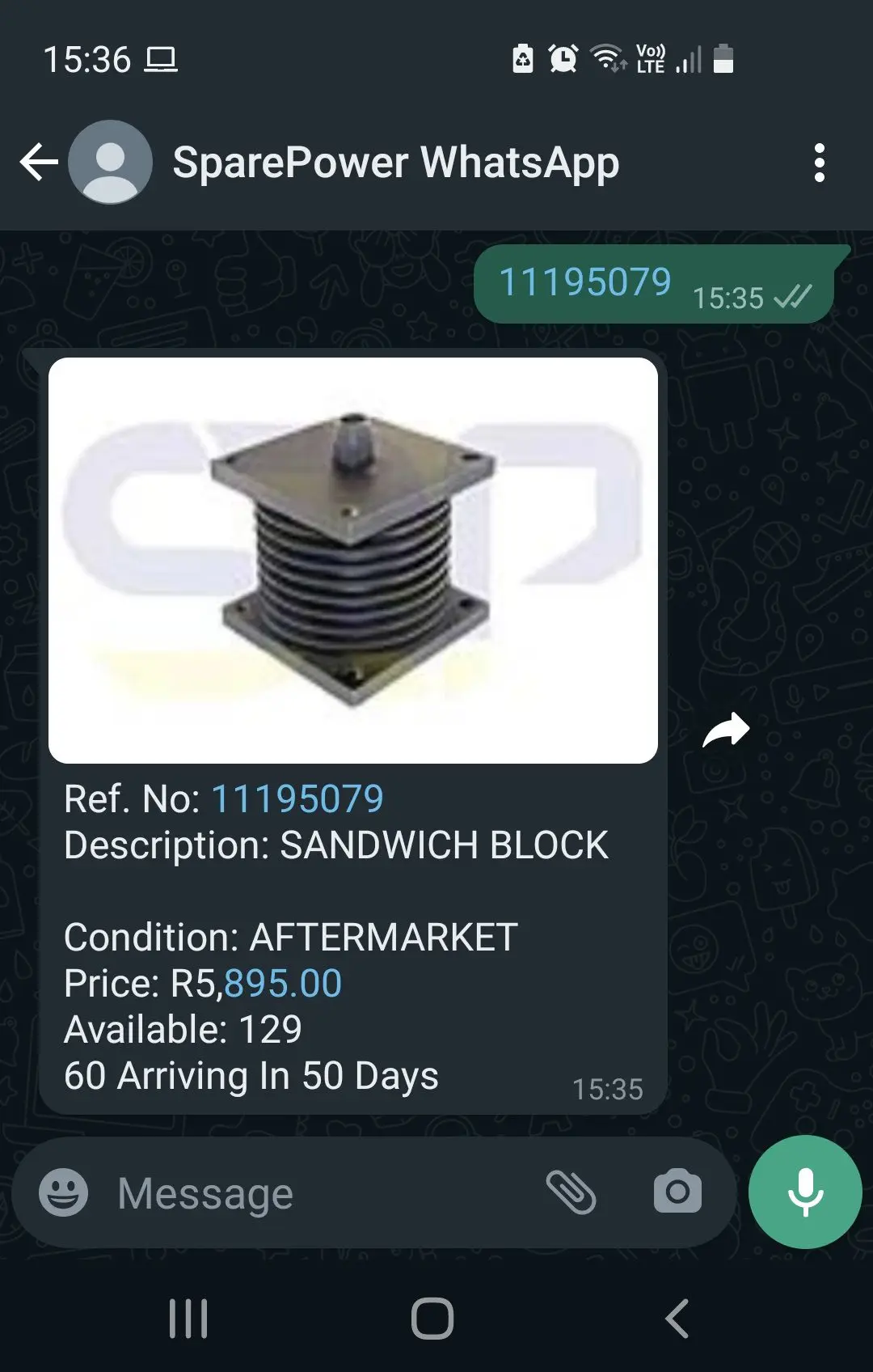 We have developed a convenient tool to make it faster and easier than ever to get availability and pricing on a part. Once registered, send your part number to the SparePower WhatsApp and the system will immediately reply with a price, stock availability and a picture.